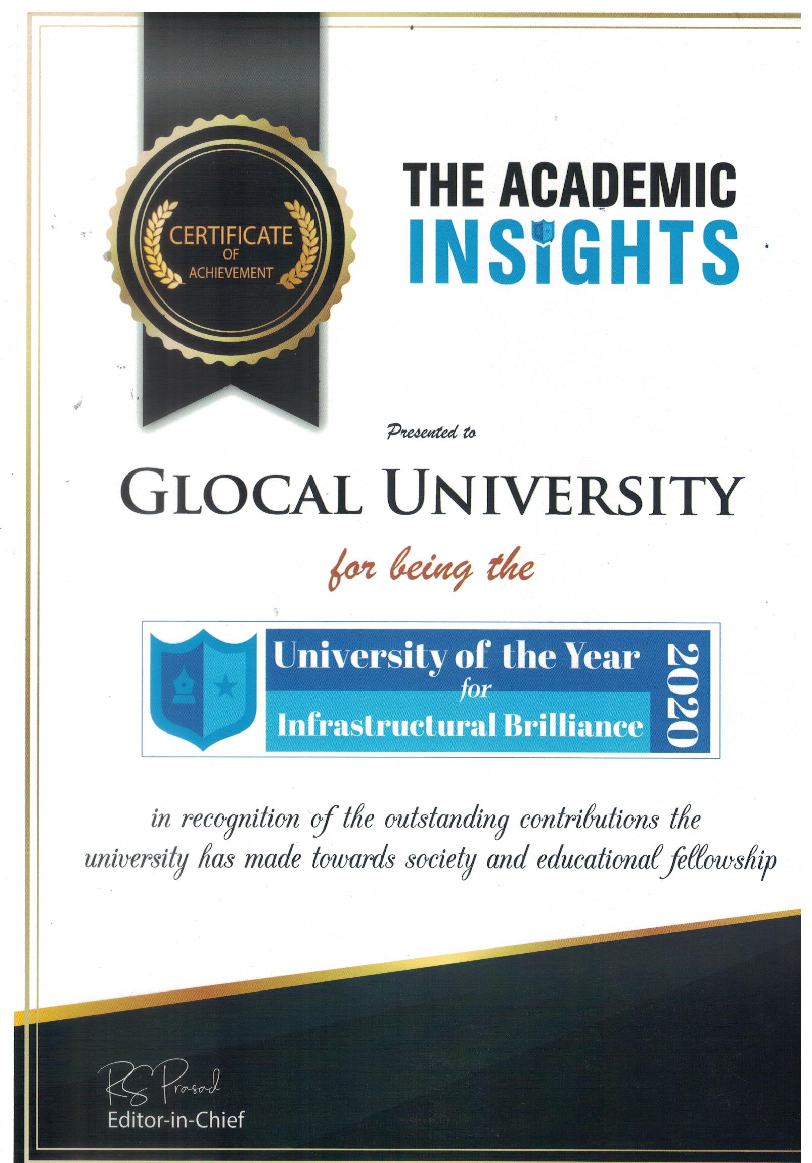 The Academic Insights presents to glocal university for being the university of the year for Infrastructure Brilliance 2020 in recognition of the outstanding contributions the university has made towards society and educational fellowship