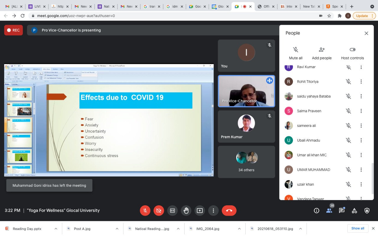 The keynote speaker of the webinar was the distinguished speaker -Dr. (Prof.) Satish Kumar Sharma (Pro- Vice Chancellor , Glocal University) . In the workshop Prof. Sharma spoke about the importance of adopting yoga as a part of daily activities to encourage physical and mental well being . The webinar was insightful and attended both national and international students . The webinar was attended by around 300 students at 3:00pm today.