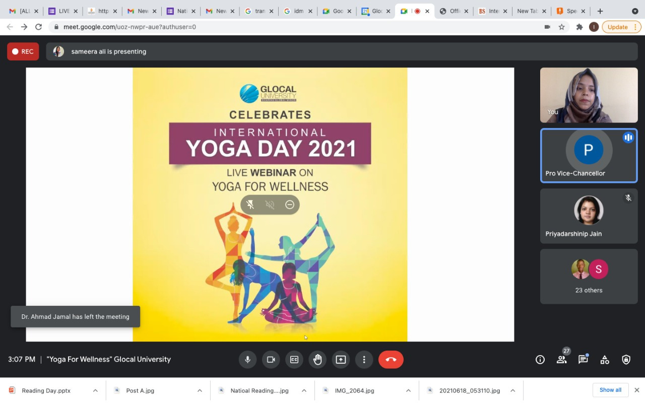 The 7th International Yoga Day was celebrated at The Glocal University on Monday, June 21, 2021. In view of the COVID-19 pandemic, this year International Yoga Day was celebrated on digital media platforms and there were no mass gatherings at the campus. Keeping this year's theme for the yoga day Yoga for Wellness, department of students welfare organized a webinar for students , staff and faculty on :Yoga for Wellness at 3 pm on June 21,2021 .